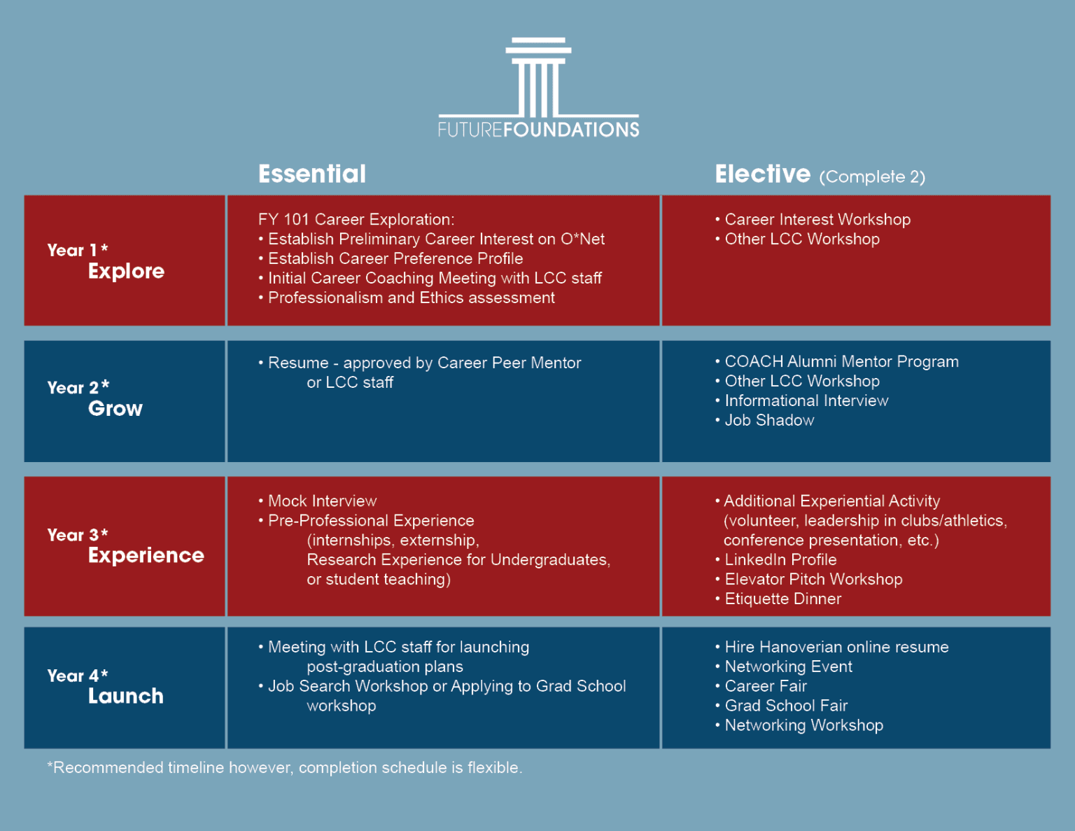 Levett Career Center staff can help students -- and advisors -- find connections between their academic passions and career paths. The Future Foundations program, for example, outlines experiences students should have in each of their four years to position them for post-graduation success. The COACH Mentoring program connects students with alumni for ongoing relationships or even just a one-time connection for exploring majors or asking career advice. Students can take interest and aptitude inventories, get help locating internships, prepare graduate school applications, receive feedback on resumes and cover letters, or use the HanoverConnect platform to connect with on-and off-campus work opportunities.
